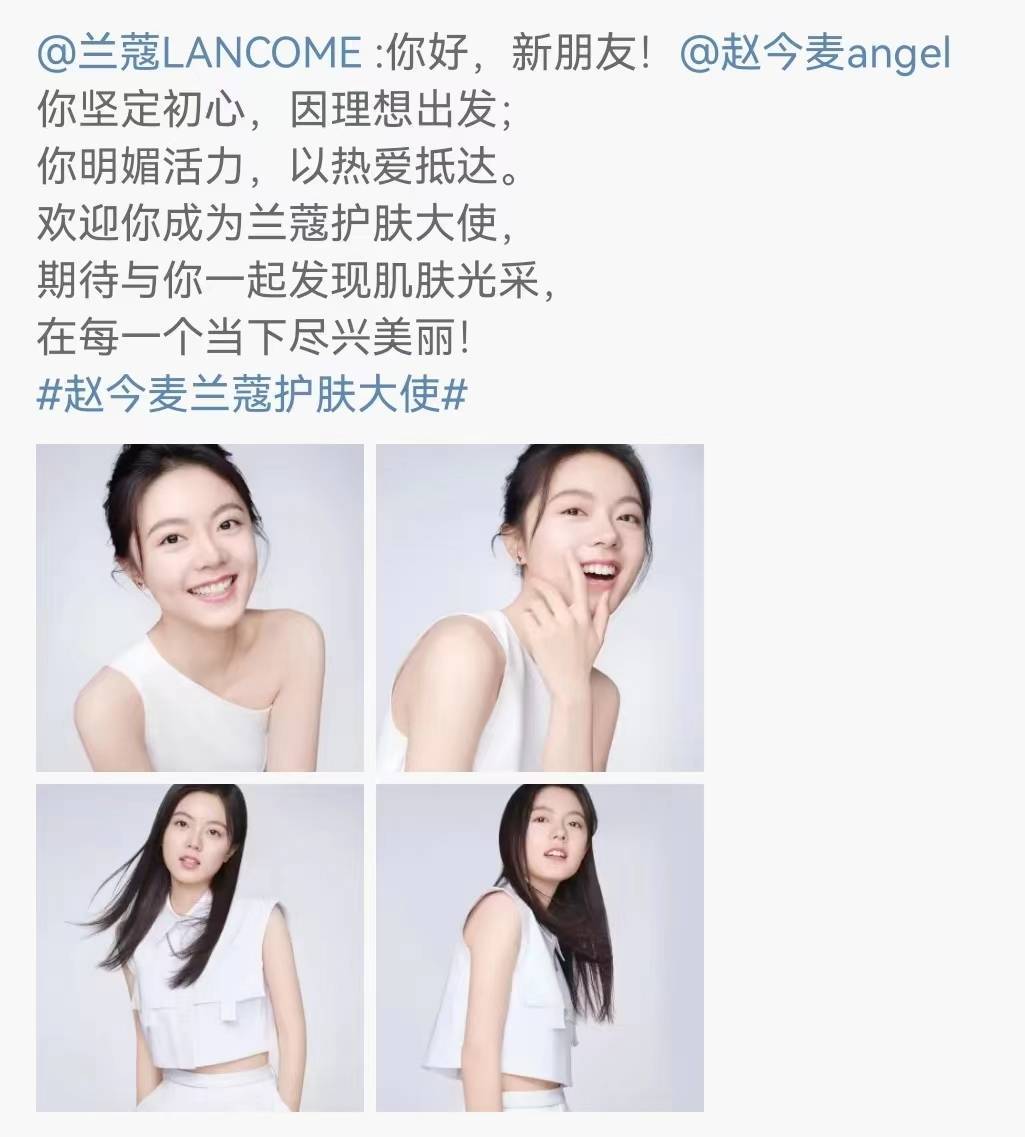 今日蘭蔻官宣護(hù)膚大使趙今麥明星代言公司),吸引了不少人關(guān)注。趙今麥穿著舒適簡單,和蘭蔻凈澈透亮的特質(zhì)非常貼合,作為全球知名的高端化妝品品牌,蘭蔻涉足護(hù)膚、彩妝、香水等多個產(chǎn)品領(lǐng)域,也看中了趙今麥身上質(zhì)感高級、風(fēng)格多變的特點,這次合作也是皆大歡喜的。
