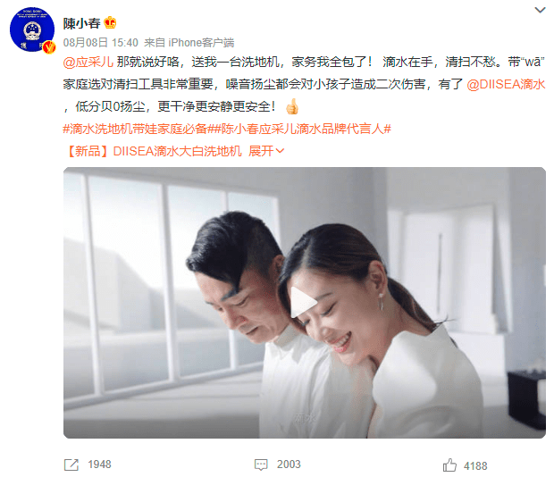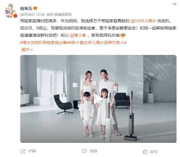 與品牌調(diào)性高度契合的代言,可以實(shí)現(xiàn)明星對品牌的加成效果最大化。陳小春和應(yīng)采兒是娛樂圈出了名的模范夫妻,同時(shí)也組成了一個(gè)幸福的四口之家,不管是早年演唱會(huì)上二人的甜蜜互動(dòng),還是《爸爸去哪兒》中二人帶娃名場面,都讓許多網(wǎng)友印象深刻。春采夫婦所體現(xiàn)的超高國民知名度、家庭幸福感以及“帶娃家庭”標(biāo)簽與滴水“更適合帶娃家庭”品牌定位和理念相契合,二者聯(lián)手將在清潔家電領(lǐng)域開啟嶄新篇章,解鎖帶娃家居清潔體驗(yàn)。