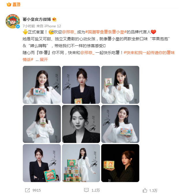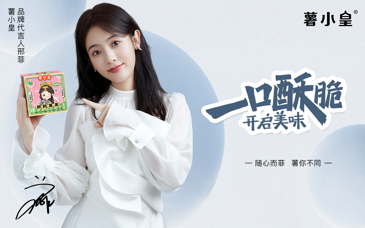 2022年9 月 26 日,新國潮薯?xiàng)l零食品牌「薯小皇」官宣邢菲(明星代言公司)為品牌代言人,并將推出「蘋果泡泡」、「辣么嗨鴨」兩種全新口味,面向消費(fèi)者上市。