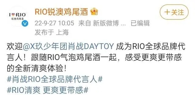 9月27日,RIO銳澳雞尾酒宣布肖戰(zhàn)(明星代言公司)成為全球品牌代言人。在肖戰(zhàn)人氣的加持下,在此之前的預(yù)熱,已經(jīng)掀起討論熱潮,今日官宣,更是引發(fā)軒然大波,短短幾個小時閱讀量已超2億。