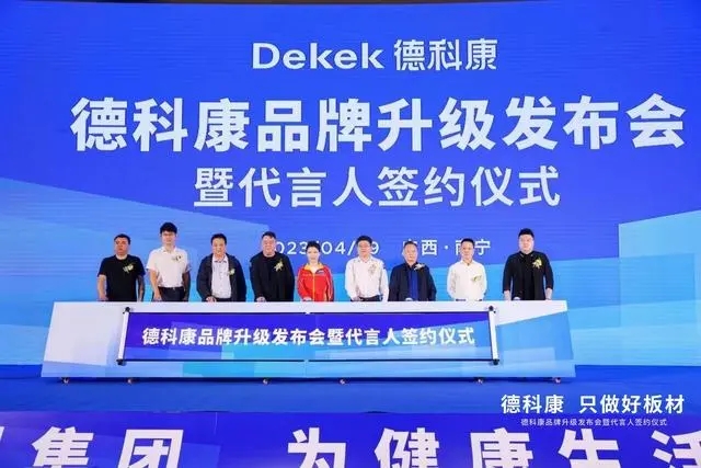 2023年4月29日,「德科康品牌升級發(fā)布會暨代言人簽約儀式」在廣西南寧隆重舉行。這是Dekek德科康品牌升級的重要戰(zhàn)略發(fā)布,同時也是其品牌代言人身份的首次曝光——2016年里約奧運女子10米氣手槍冠軍張夢雪(明星代言公司),攜手德科康品牌,為FOSB好板材代言。