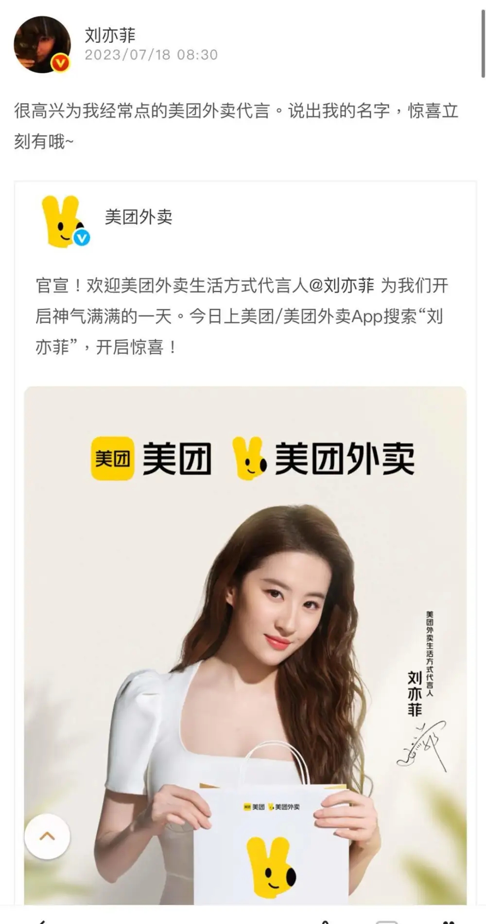 近日美團(tuán)外賣官宣劉亦菲(明星代言公司)為品牌代言人。劉亦菲轉(zhuǎn)發(fā)并發(fā)文稱,“很高興為我經(jīng)常點(diǎn)的美團(tuán)外賣代言。說出我的名字,驚喜立刻有哦~”。