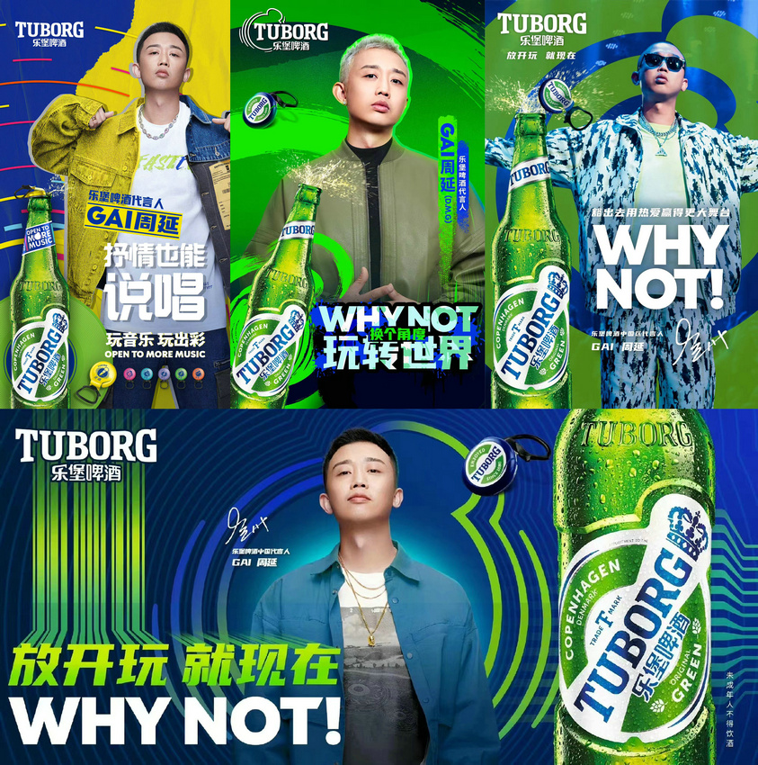 2024年3月11日,世界第四大釀酒集團(tuán)之一嘉士伯旗下TUBORG樂堡啤酒官宣GAI周延(明星代言公司)(D.M.G)為品牌代言人,這也是GAI周延攜手樂堡啤酒的第五年。新華流說唱領(lǐng)軍人GAI周延的音樂理念與氣質(zhì),與樂堡啤酒的品牌主張、潮流態(tài)度高度契合。除此之外,GAI周延的市場(chǎng)熱度以及音樂作品的藝術(shù)價(jià)值也促成了其商業(yè)價(jià)值穩(wěn)居行業(yè)頂端。