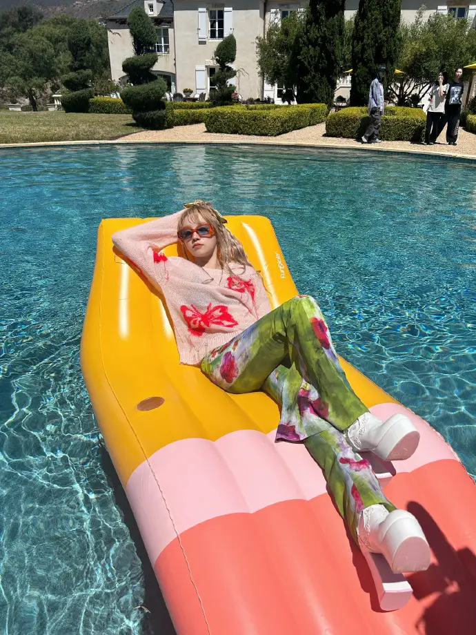 宋雨琦帶墨鏡躺在泳池上曬太陽(yáng),粗高跟星味十足。