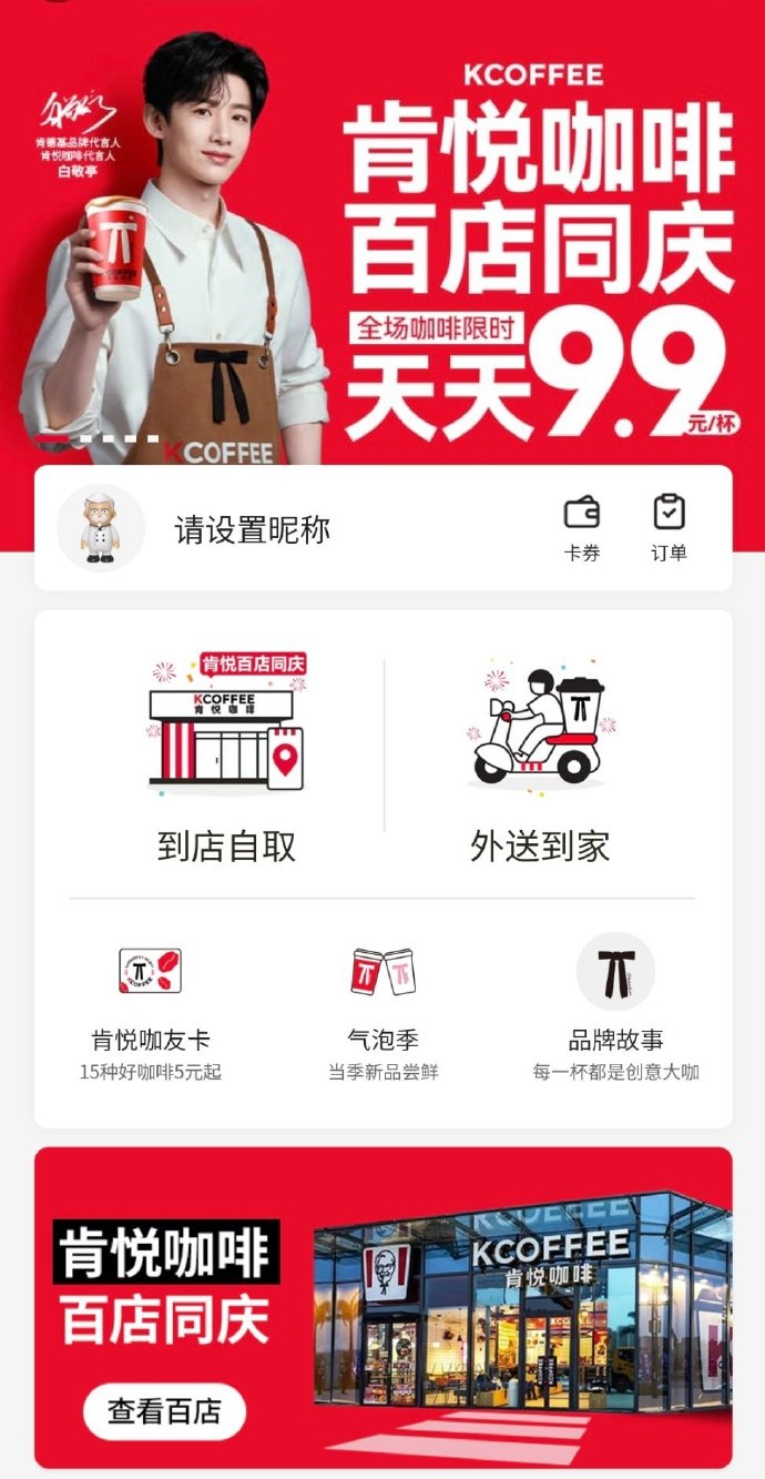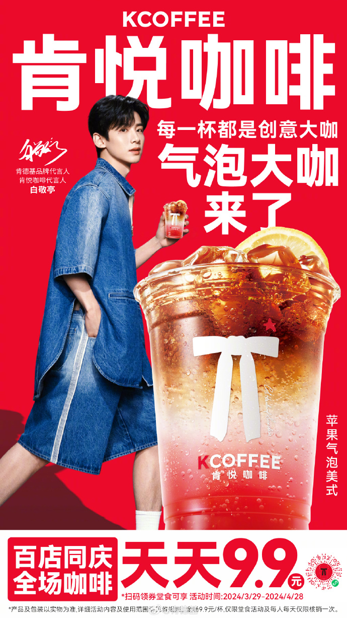 4 月 6 日,肯德基官宣白敬亭(明星代言公司)成為 KCOFFEE 肯悅咖啡代言人,在肯悅咖啡迎來百店之際開啟限時天天 9.9 元優(yōu)惠活動。同期,肯悅咖啡推出「氣泡大咖」新款飲品,加入 NFC 果汁與氣泡水打造別樣風(fēng)味,彰顯肯德基肯悅咖啡的獨特創(chuàng)意個性。
