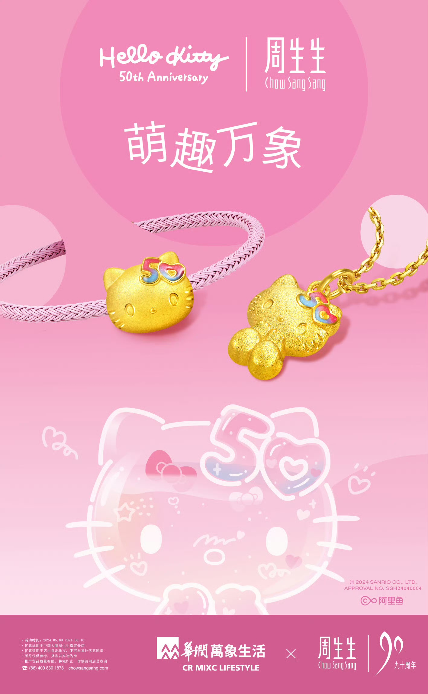 同期,周生生聯(lián)合天貓超級品牌日邀請品牌大使安宇空降周生生天貓官方旗艦店直播間,與觀眾一起解鎖「可愛藏不住」的周生生與 hello kitty 合作款 50 周年黃金美飾。