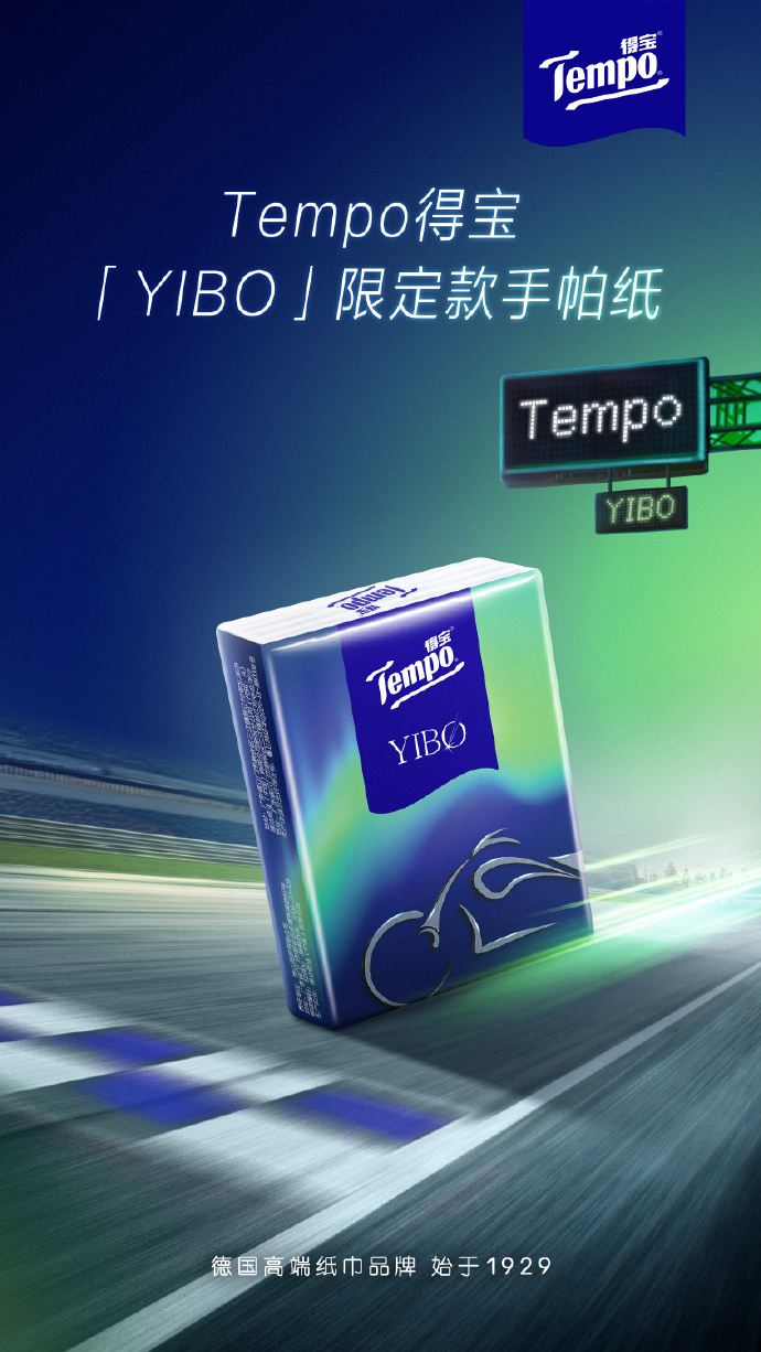 同期,Tempo 得寶推出王一博限定款 YIBO 手帕紙,印有璀璨綠與得寶藍設計印花,包裝印有摩托車車型紋樣,與王一博的率性氣質相呼應。Tempo 得寶攜手天貓超級品牌日推出「一路生花」「與博同行」「王炸 de 寶」等明星套組,附贈藝人立牌小卡周邊,加碼官宣代言活動。