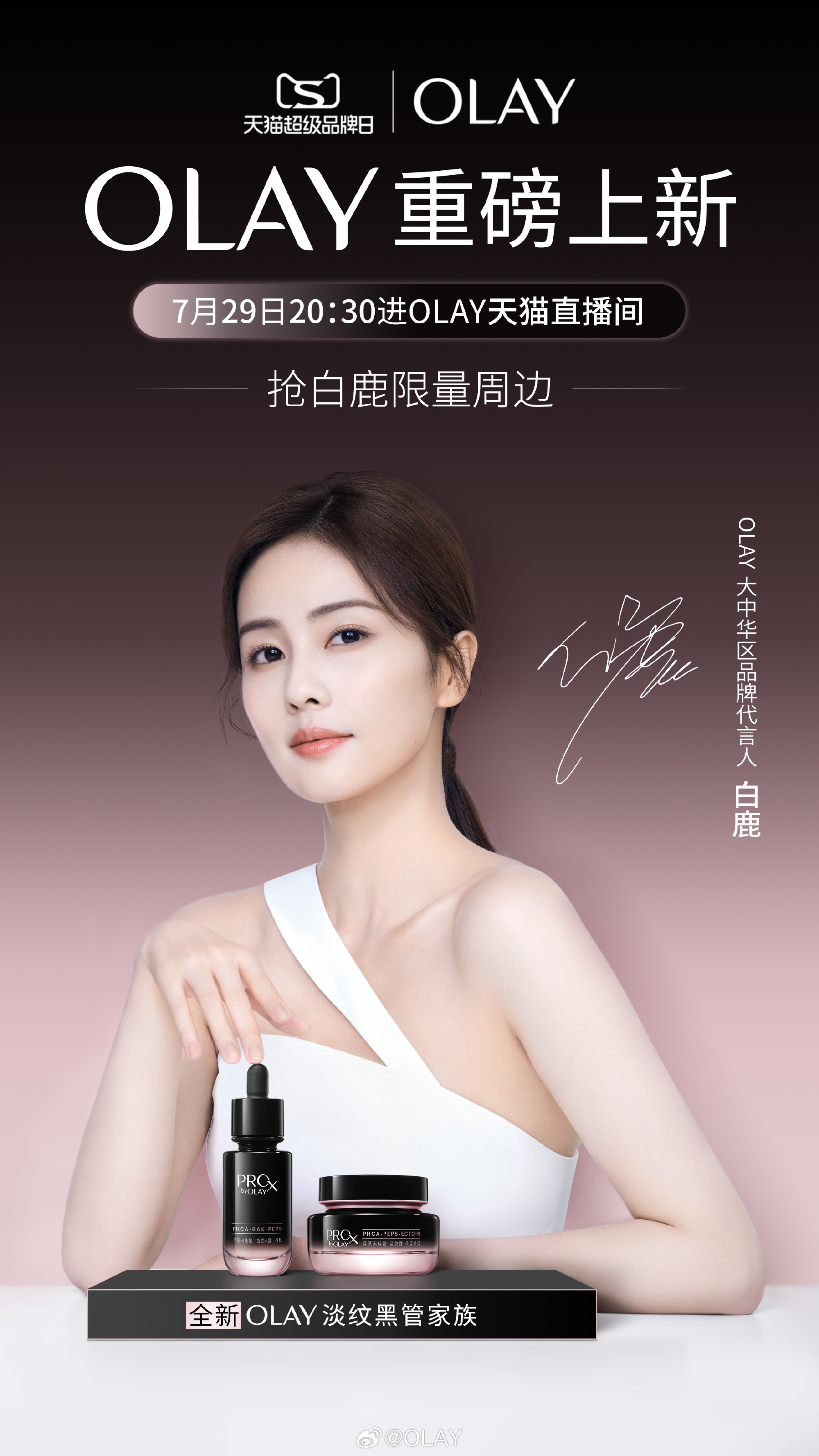 7 月 29 日,OLAY 邀請(qǐng)品牌代言人白鹿空降天貓直播間,帶來 OLAY 淡紋黑管精華新品首發(fā)。同期,OLAY 聯(lián)合天貓超級(jí)品牌日打造新品優(yōu)惠禮贈(zèng),邀請(qǐng)用戶感受卓效溫和的抗老護(hù)膚。
