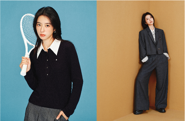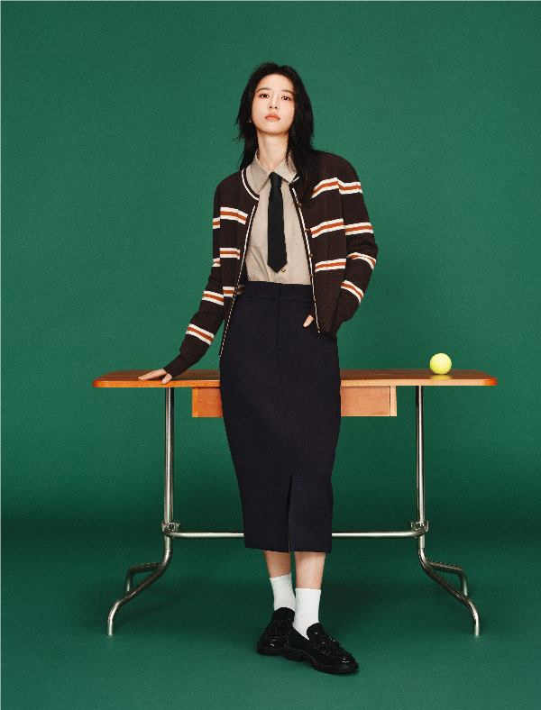 青藤學(xué)院感假兩件毛衫和中腰百褶裙塑造正統(tǒng)學(xué)院的書卷氣優(yōu)等生形象;多巴胺自然南瓜色系條紋毛織開衫搭配麥田色襯衫及直身開叉筒裙,平衡精英氣質(zhì)與松弛態(tài)度。多樣混搭的自由感造型與周雨彤直率輕盈的個(gè)性魅力相契合,傳遞PSALTER詩篇品牌不被傳統(tǒng)學(xué)院標(biāo)簽所固定,也不為自己設(shè)限的無畏個(gè)性。