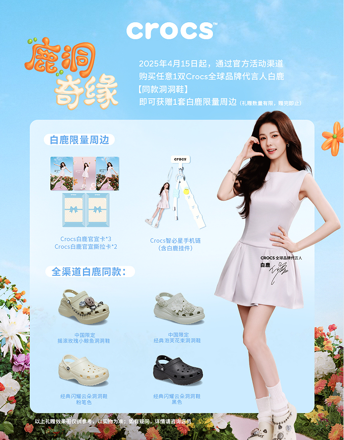 此次,白鹿同款的兩款洞洞鞋——搖滾玫瑰小鯨魚洞洞鞋、經(jīng)典泡芙花束洞洞鞋,皆為中國區(qū)限定鞋款。4 月 15 日-21 日,消費者于 Crocs 天貓超級品牌日期間,在天貓官方旗艦店購買白鹿同款洞洞鞋即可解鎖代言人專屬限量周邊。此外,4 月 20 日,代言人白鹿還會空降 Crocs 天貓官方旗艦店直播間為洞門人派發(fā)多重驚喜福利。