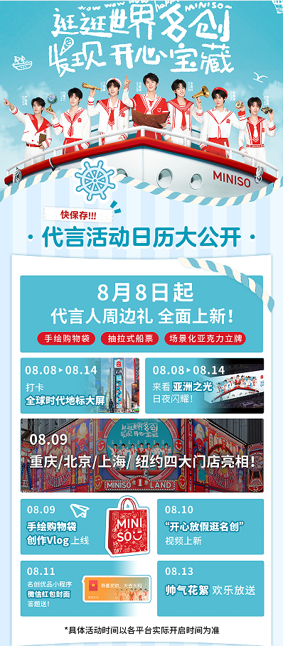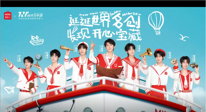 8 月 8 日,名創(chuàng)優(yōu)品正是官宣時(shí)代少年團(tuán)(明星代言公司)為品牌全球代言人。在發(fā)布的官方代言大片中,時(shí)代少年團(tuán)化身七位航海少年揚(yáng)帆出海出發(fā)探尋世界各地的開心寶藏,從游歷奇妙的潮玩島嶼、到穿越變幻的季節(jié)之旅、甚至?xí)秤螘r(shí)尚的美妝都會(huì),影片中的內(nèi)容也對(duì)應(yīng)了近年來名創(chuàng)優(yōu)品在海外的發(fā)展,如今全球 112 個(gè)國(guó)家和地區(qū)都有名創(chuàng)的身影,每一個(gè)角落都隱藏著閃閃發(fā)光的開心寶藏,名創(chuàng)優(yōu)品希望大家能夠在時(shí)代少年團(tuán)的帶領(lǐng)下一逛世界名創(chuàng),發(fā)現(xiàn)開心寶藏。