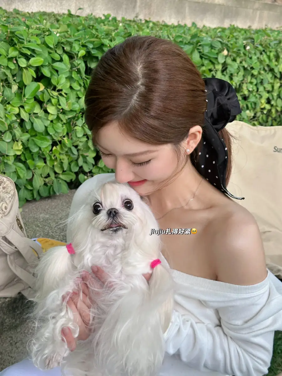 趙露思低頭看小狗,小露香肩清純誘惑。