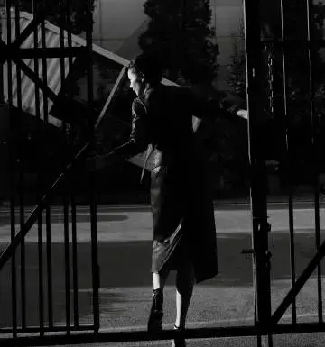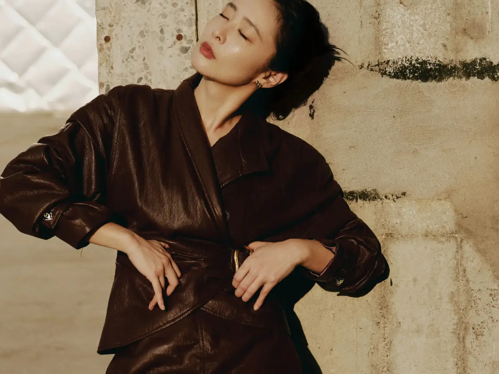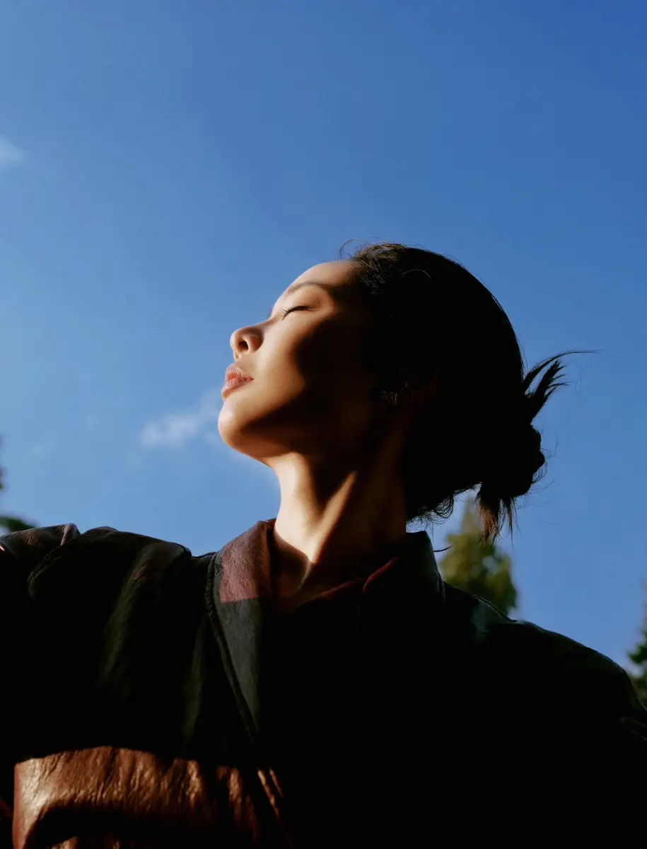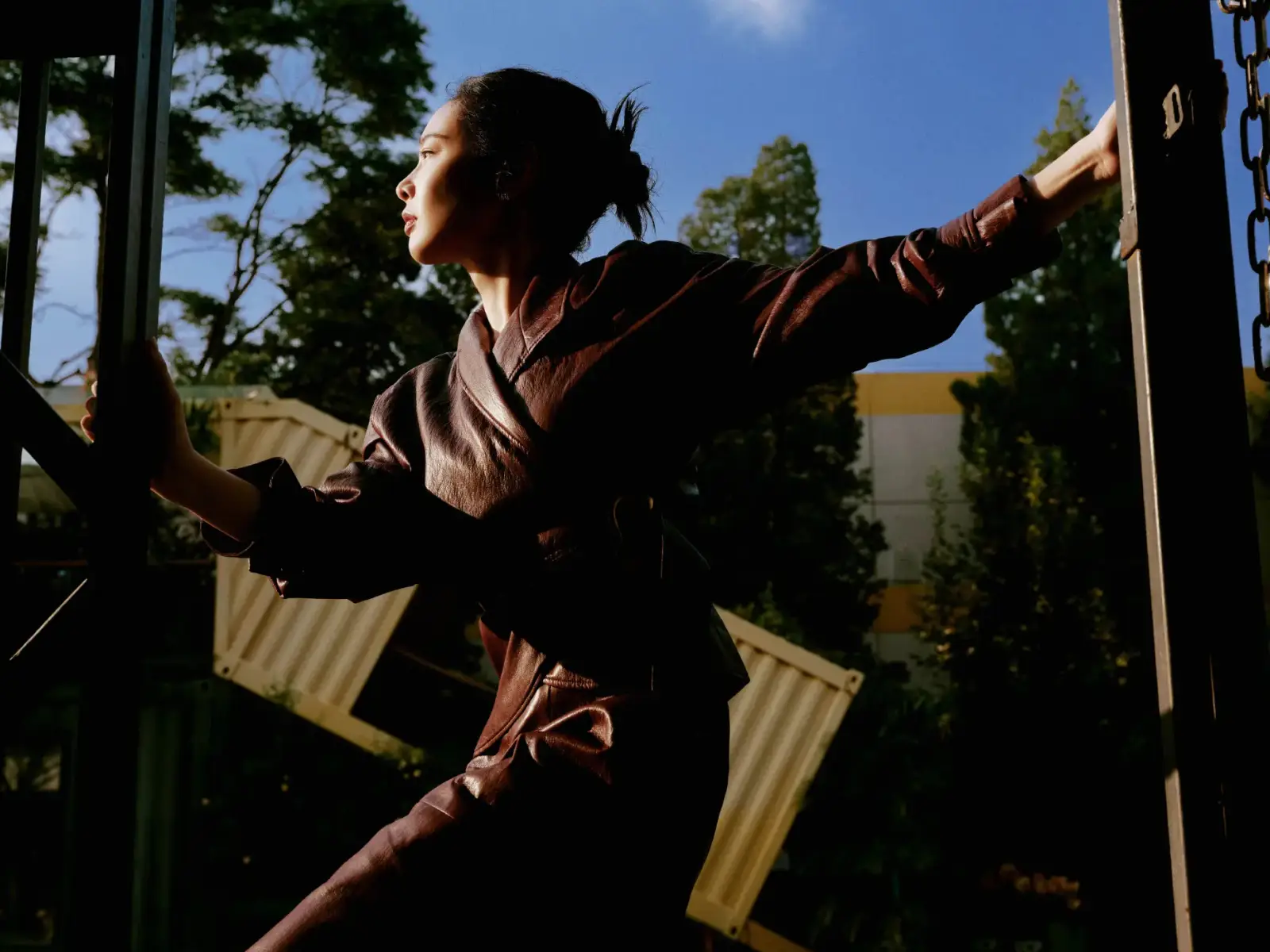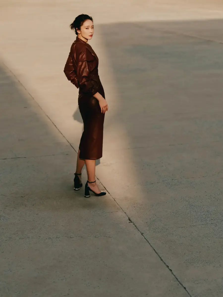 高葉酒紅色皮裙眼神冷酷 陽光下漫步釋放成熟韻味