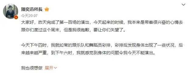 5月25日,陳奕迅(明星經(jīng)紀(jì)公司)在杭州演唱會開場前登臺宣布,因自己聲帶不適,本周末兩場演唱會將延期至5月27日、28日,并含淚鞠躬致歉。主辦方工作人員承諾除了將為想退票的觀眾全額退款外...