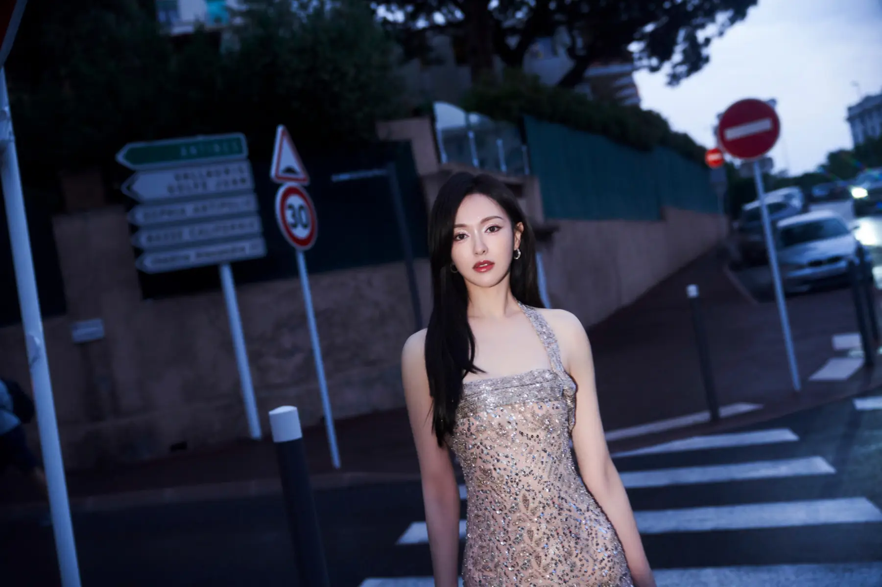 唐嫣穿亮片刺繡裙明艷照人 戛納海邊佇立滿眼星河