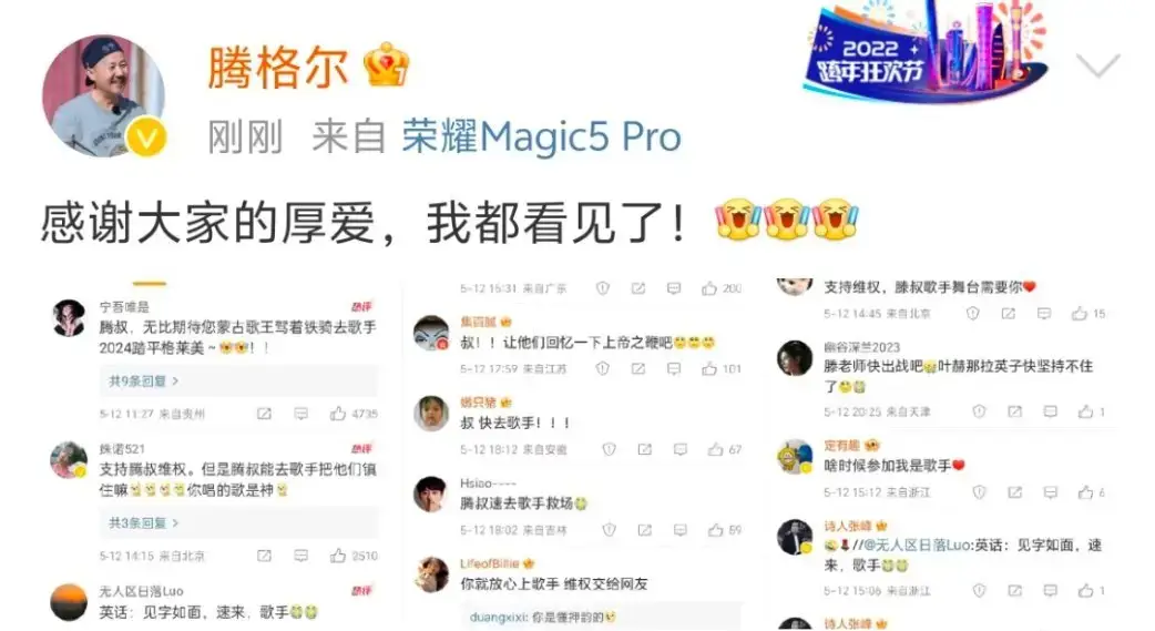 5月12日,騰格爾在個人社交賬號發(fā)文,回應(yīng)了網(wǎng)友們喊話他上《歌手》的請求,并表示:感謝大家的厚愛,我都看見了。