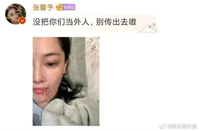 10月30日,張馨予在個人社交賬號上曬出做針灸的自拍照,引發(fā)網(wǎng)友關注。照片中張馨予躺在床上,曬出半張臉,他的臉上插滿了治療用的針,看起來像是刺猬一樣。