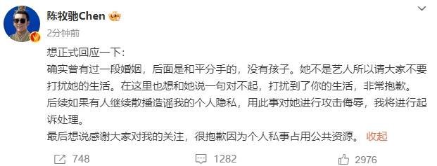 10月12日,陳牧馳(明星經(jīng)紀(jì)公司)在個人社交賬號上發(fā)文承認(rèn)曾經(jīng)結(jié)過婚,但否認(rèn)有過孩子?!八皇撬嚾怂哉埓蠹也灰驍_她的生活。在這里也想和她說一句對不起,打擾到了你的生活,非常抱歉?!?/span>