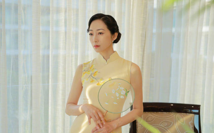 韓雪身著淡黃色旗袍氣質溫婉腰肢纖細