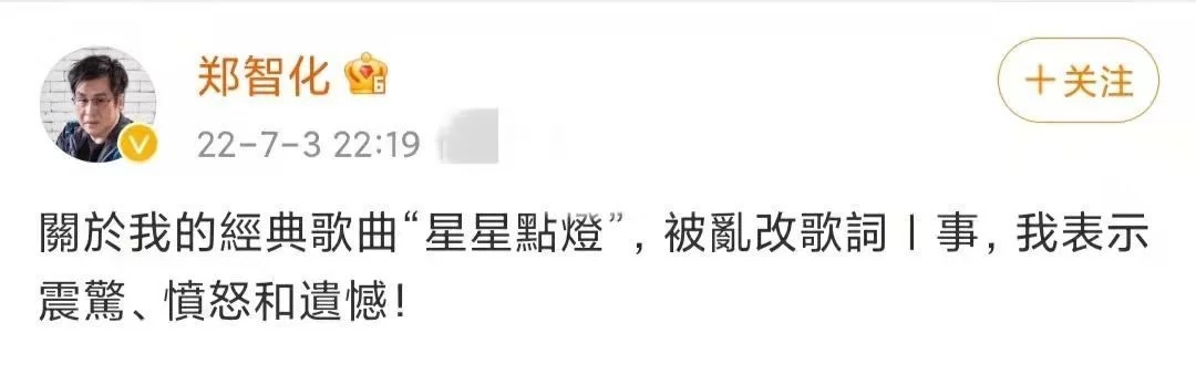 鄭智化(明星經(jīng)紀(jì)公司)、知名唱作人,代表作有《水手》和《星星點(diǎn)燈》等,他深夜憤怒發(fā)文后,網(wǎng)友紛紛發(fā)聲支持。有網(wǎng)友稱此番改編是畫蛇添足,讓原本經(jīng)典的《星星點(diǎn)燈》變成了另外一首歌。