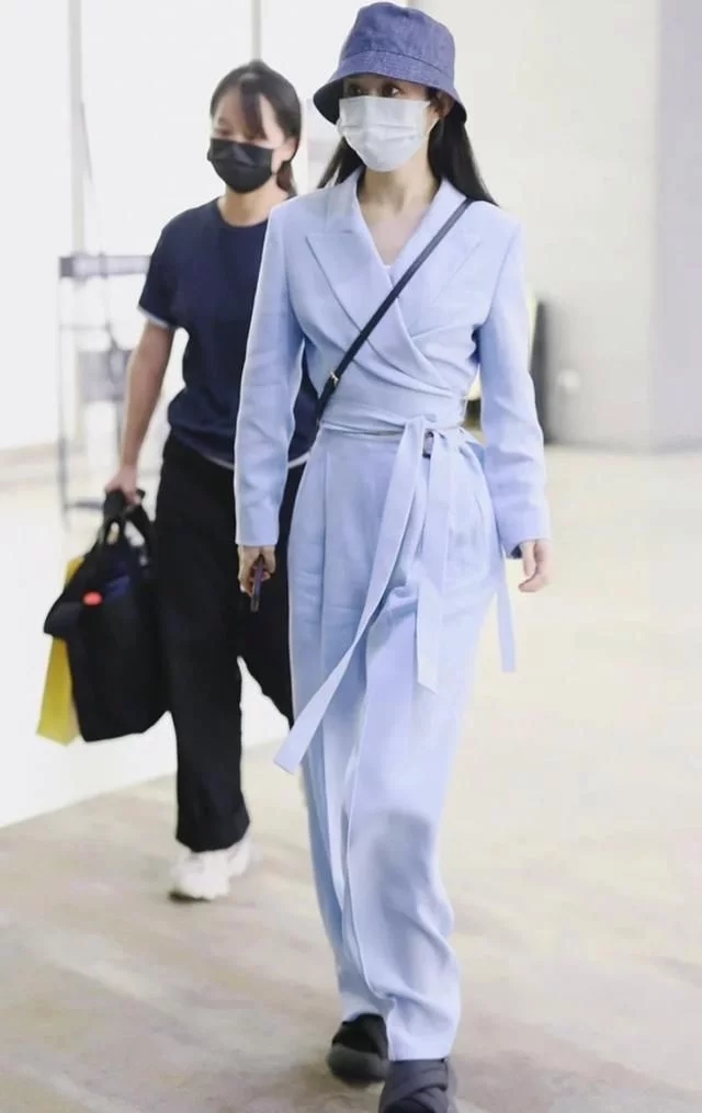 雖然這套衣服是西裝版型,但整體還是更偏向休閑風(fēng)。趙麗穎外出時(shí),也更喜歡舒適的穿搭,于是她選擇了同色系的漁夫帽以及黑色厚底拖鞋。