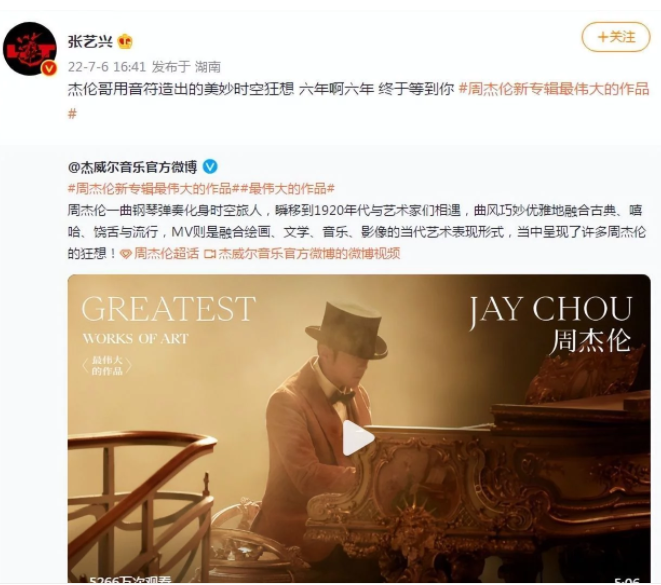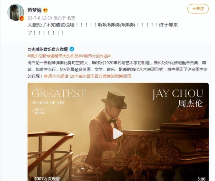2022年7月6日中午12點(diǎn),周杰倫新專輯《最偉大的作品》同名歌曲MV公開,很多明星發(fā)微博為其打call,我們來看看都有誰。