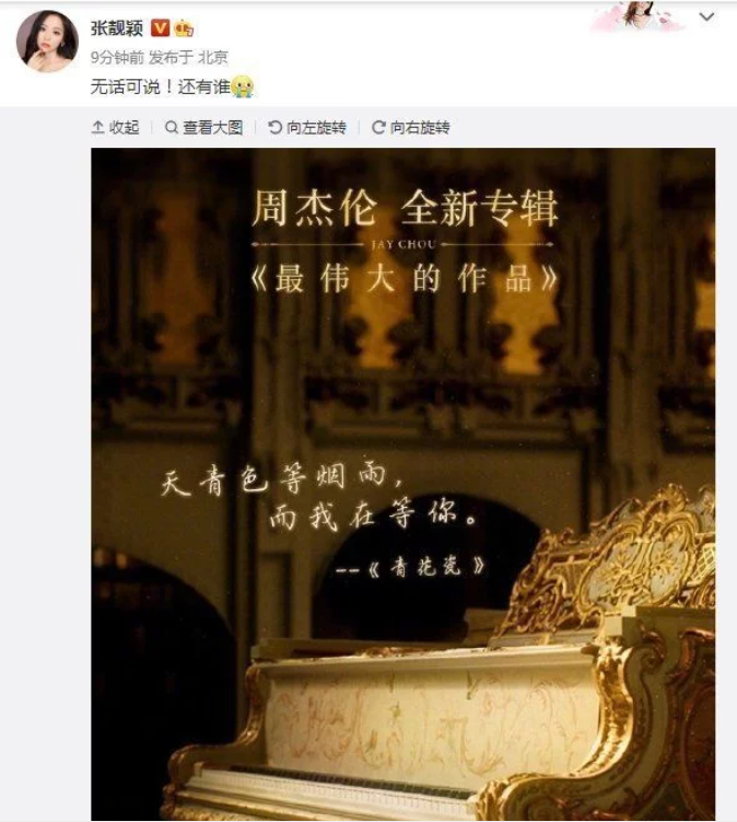 張靚穎說:“無話可說,還有誰?”張靚穎甚至帶了周杰倫新歌的購買二維碼,被我裁掉了。張靚穎是不是拿了周杰倫的營銷費(fèi)用呢?是不是有提成呢?哈哈,開玩笑,張靚穎只是單純地喜歡周杰倫。