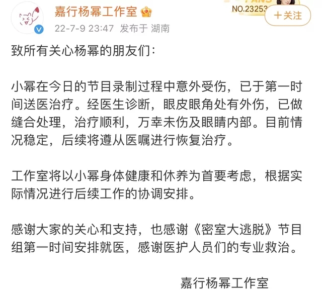 7月9日,楊冪錄制《密室大逃脫》意外受傷的消息沖上熱搜,隨后引起熱議。