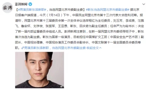 近日,男演員靳東添新職,當選民盟北京市委副主委。