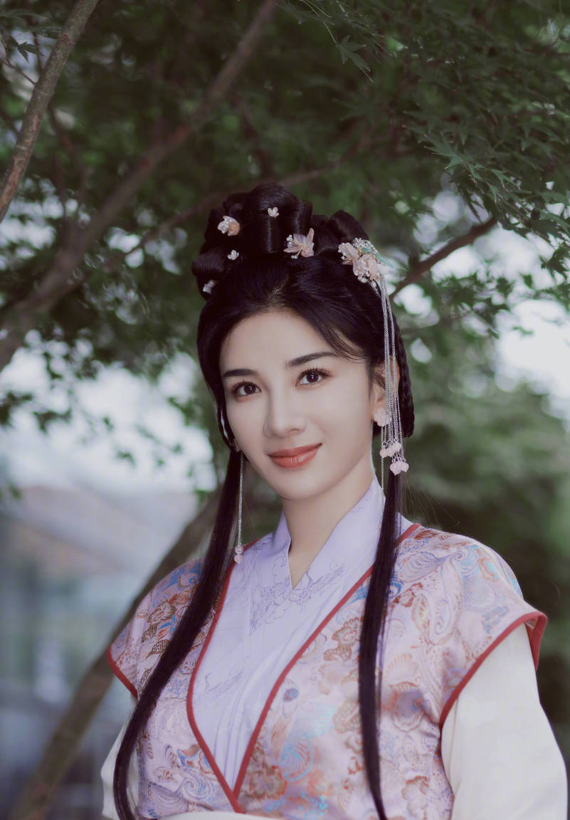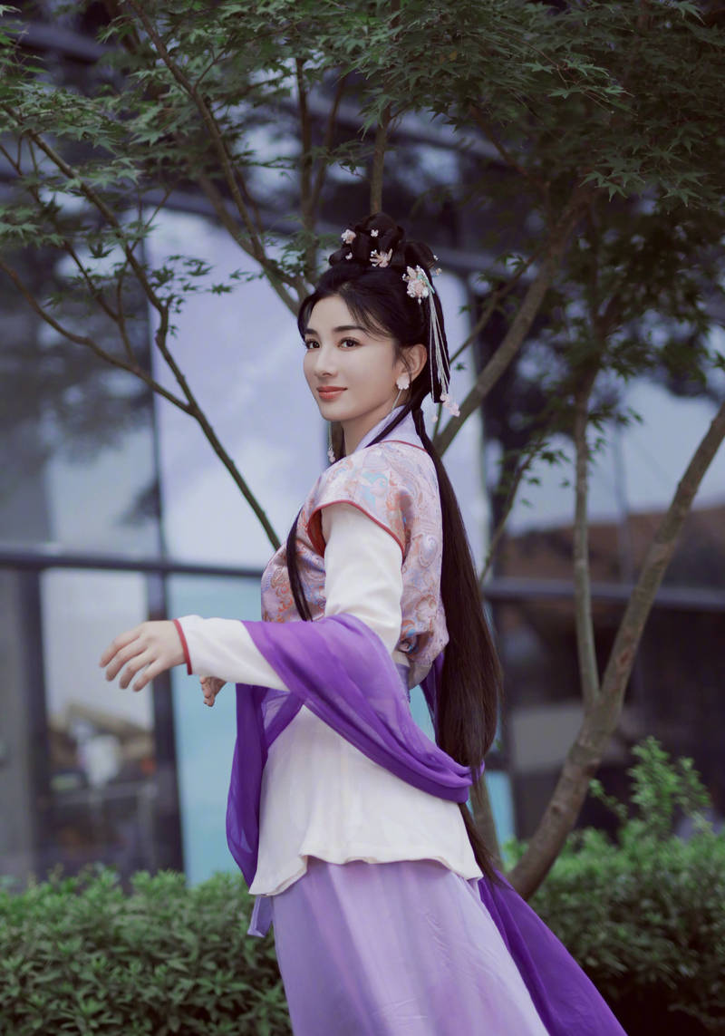 黃奕一身粉紫色少女羅裙,再扮李玉湖。