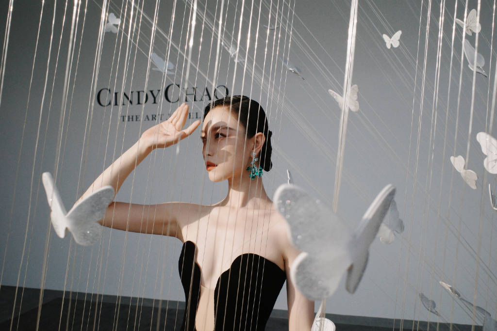 倪妮佩戴寶石耳墜與戒指,珠光寶氣。