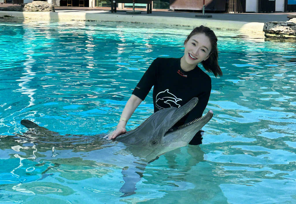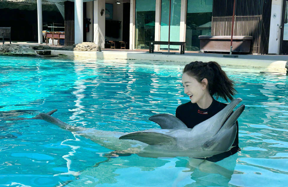 李小冉和海豚互動快樂有趣 扎高馬尾清純靈動