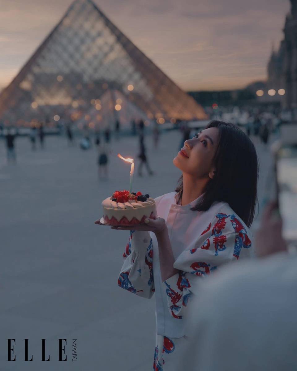 賈靜雯在盧浮宮前慶祝49歲生日 手捧蛋糕笑容超甜