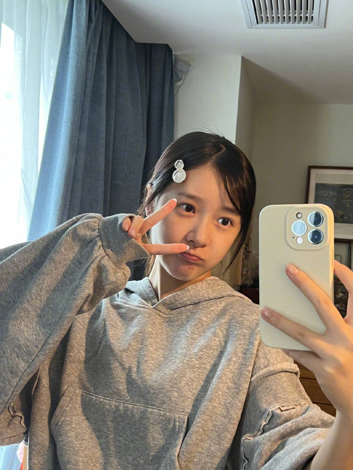 徐嬌對(duì)鏡自拍,素顏出鏡,比耶好可愛(ài)。