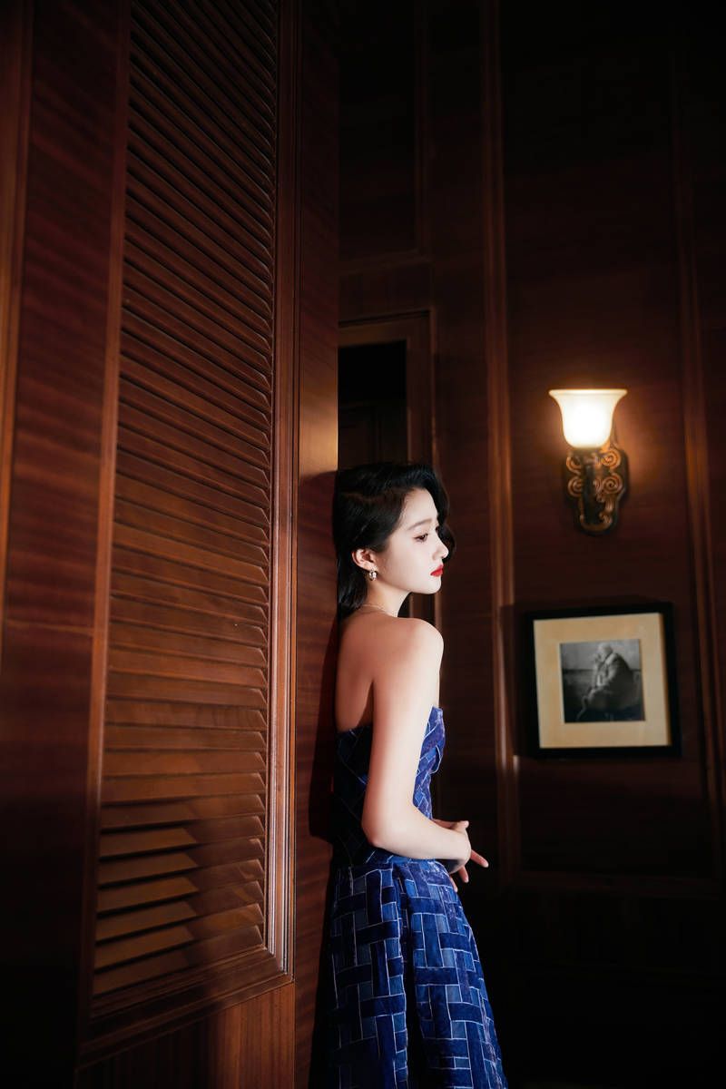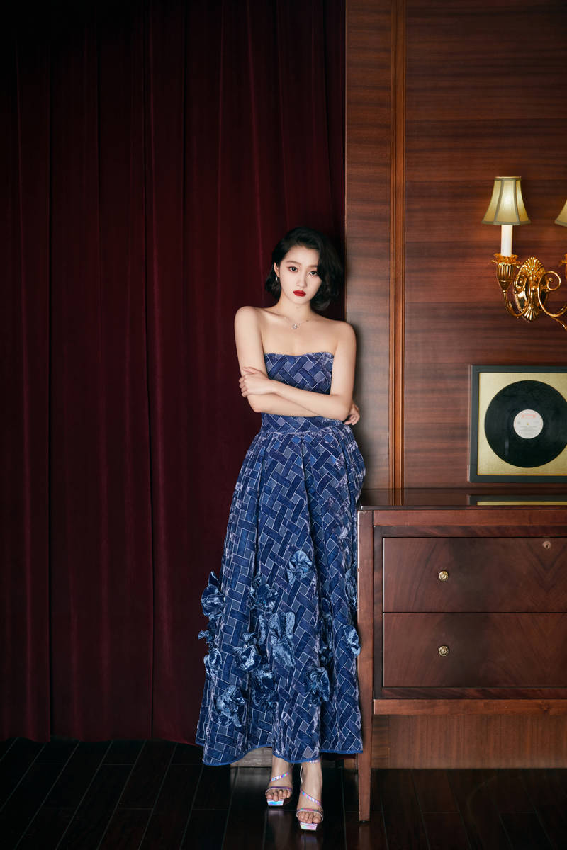 關(guān)曉彤穿復(fù)古藍(lán)色花朵裙,優(yōu)雅高貴。
