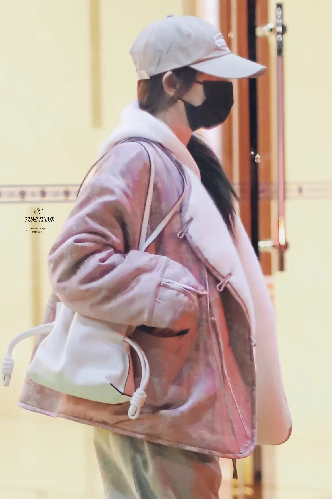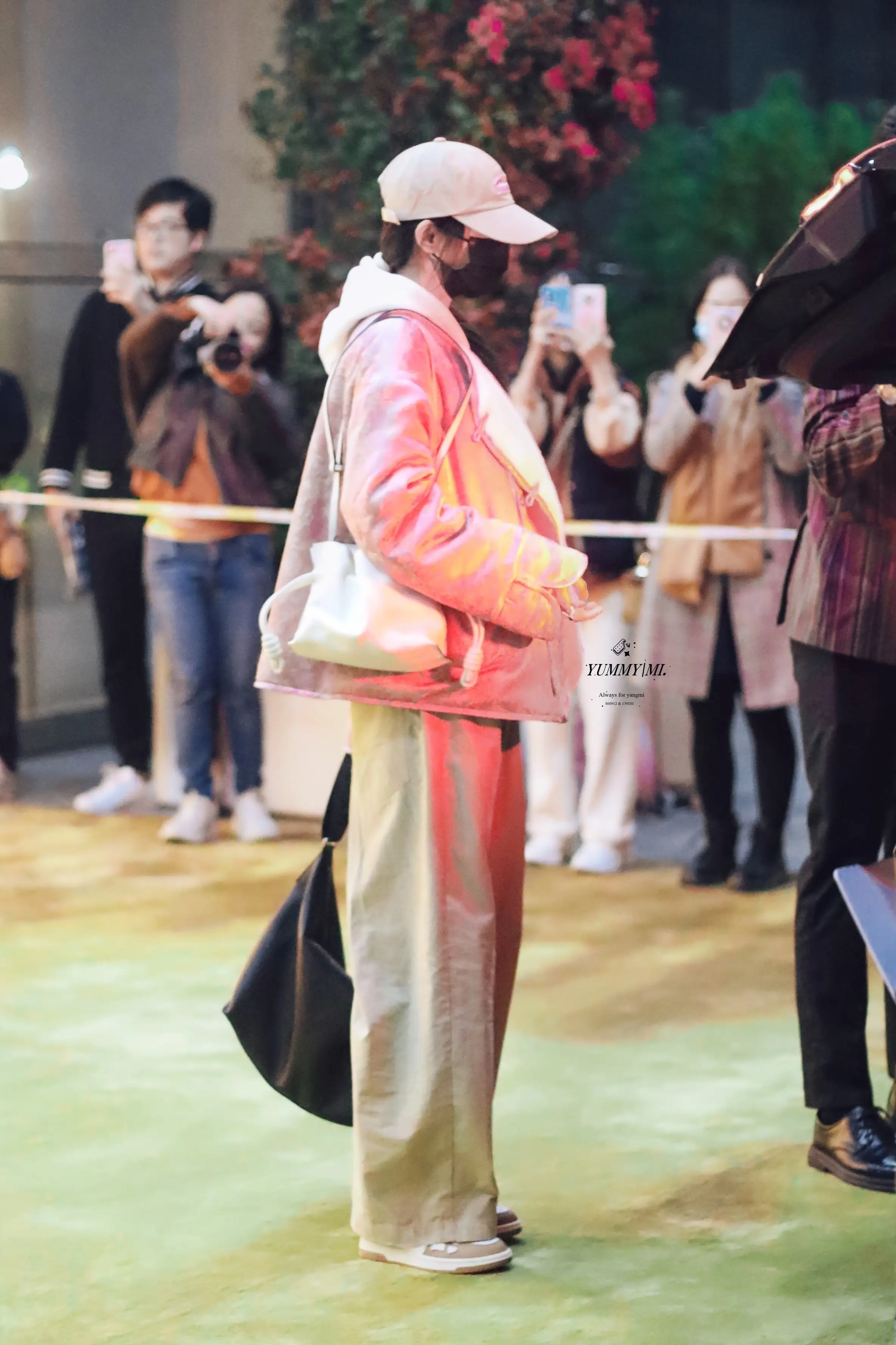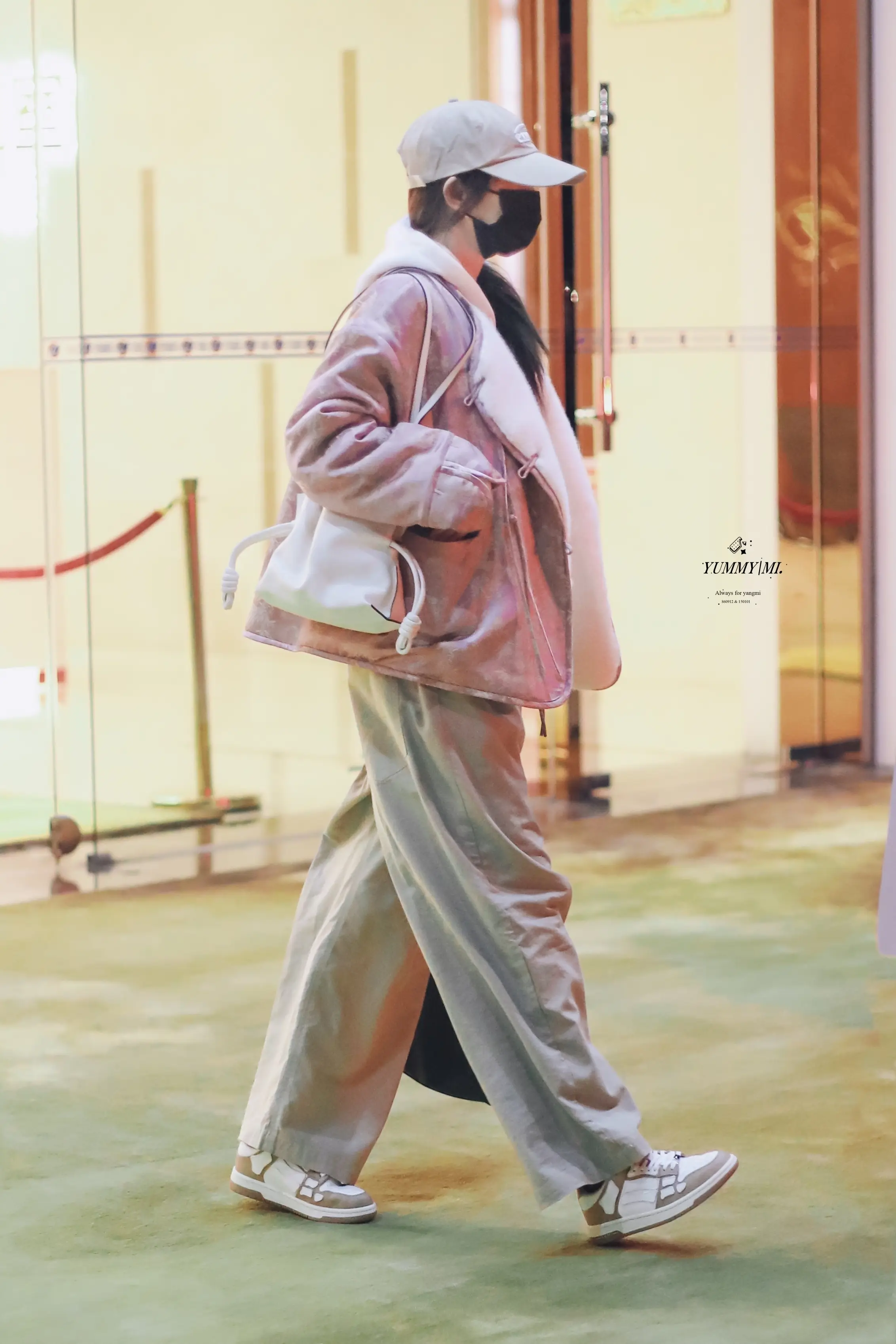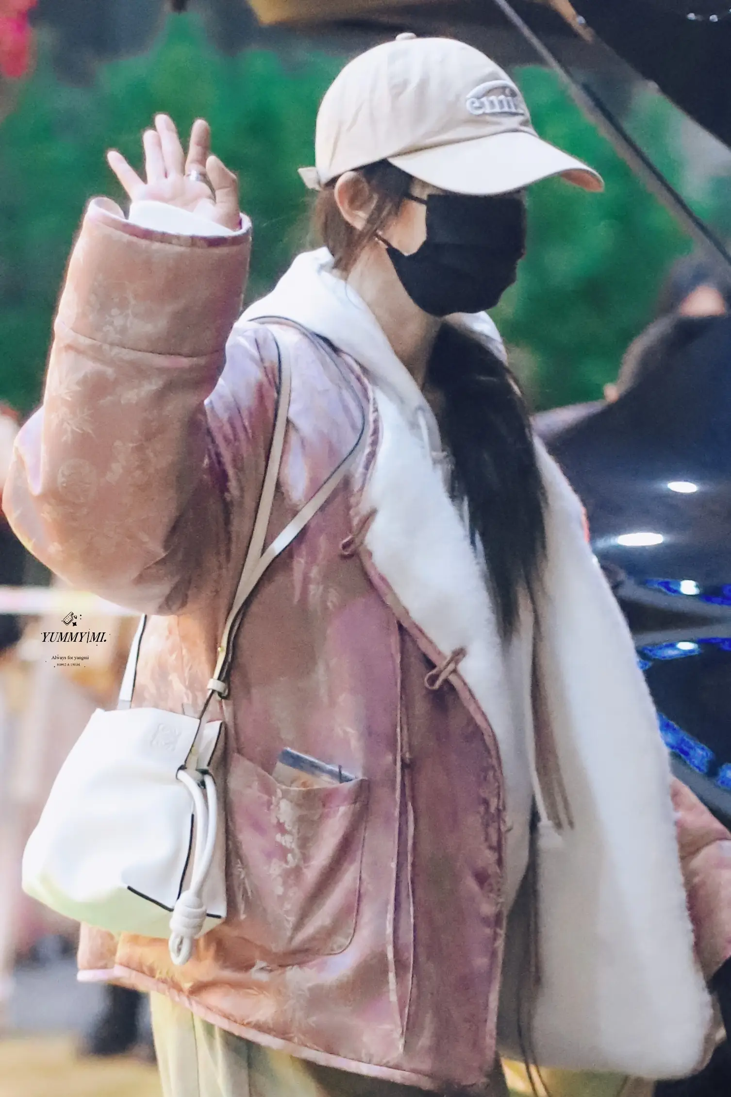 楊冪用白色抽帶細(xì)帶包搭配粉色新中式棉服。
