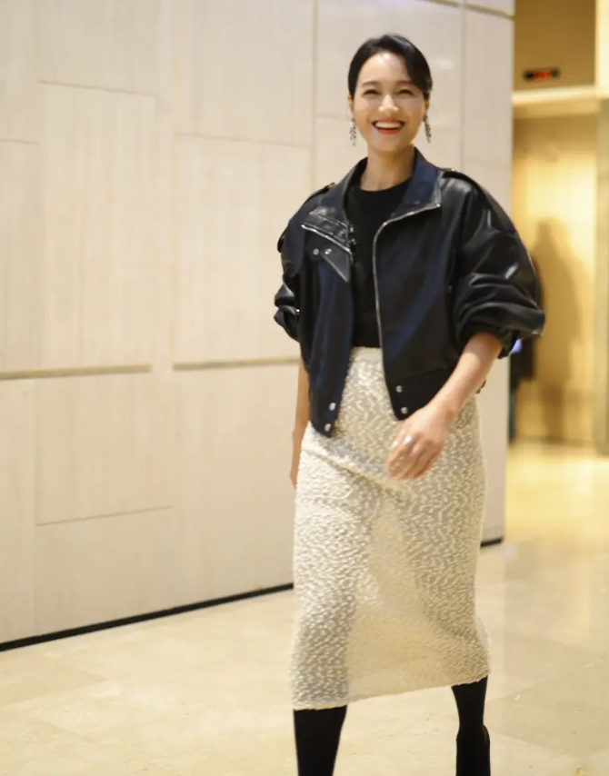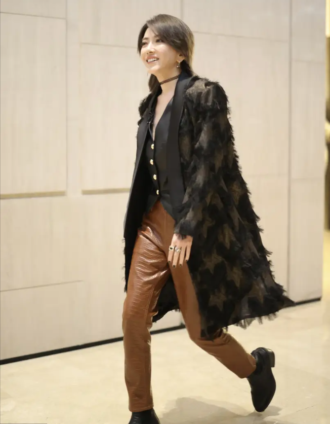 朱丹酒店出發(fā)前往錄制現(xiàn)場,身著皮衣夾克干練十足。
