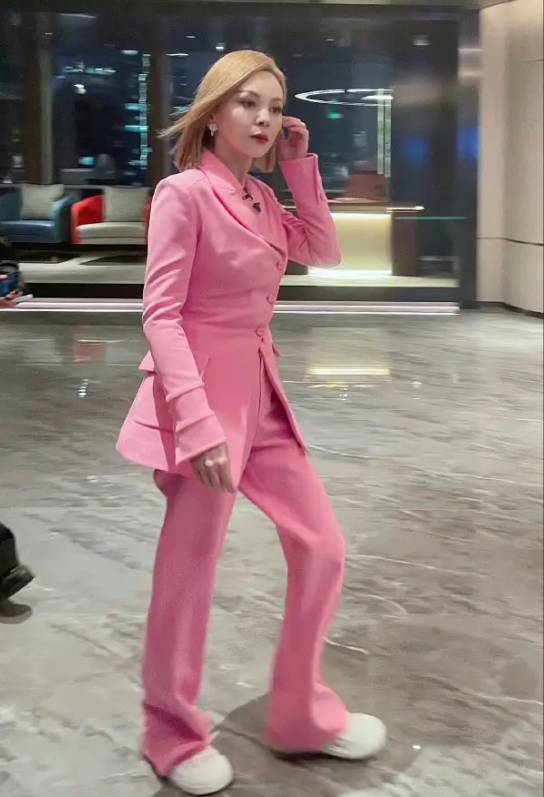 王琳(雪姨)酒店出發(fā)前往錄制現(xiàn)場,穿一身芭比粉西服套裝,身材優(yōu)越。