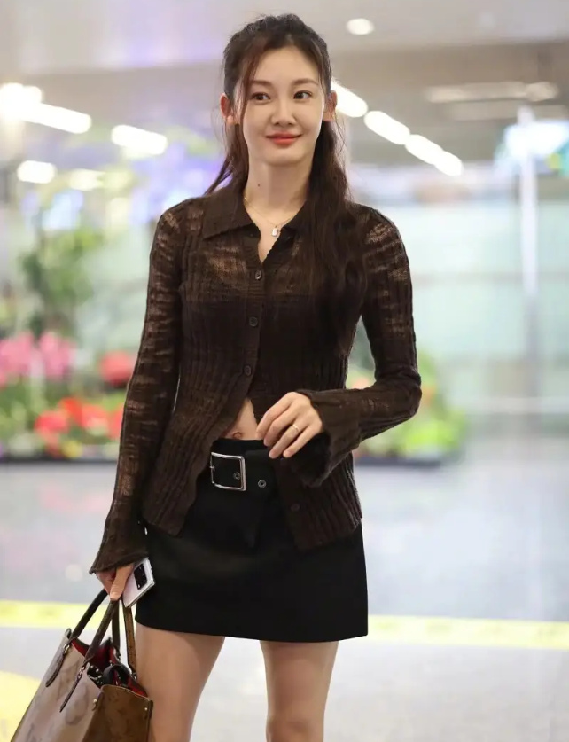 苗苗出發(fā)前往錄制現(xiàn)場,穿棕色鏤空透視上衣,時髦感十足。