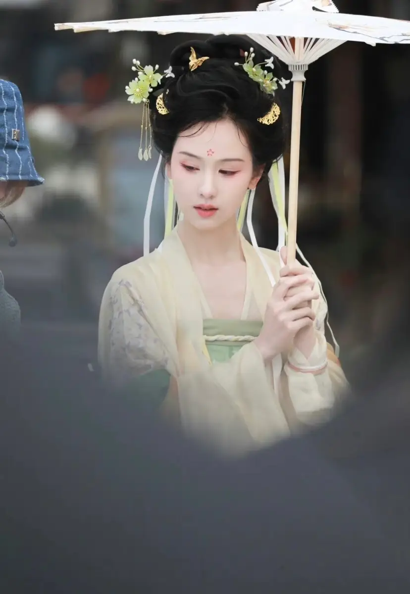 陳都靈穿嫩黃色唐制漢服,眉間花鈿盡顯柔美。
