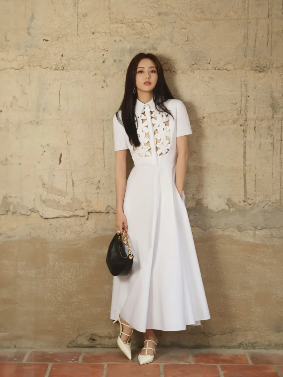 佟麗婭身穿白色鏤空初戀裙 搭配大耳飾張揚(yáng)迷人