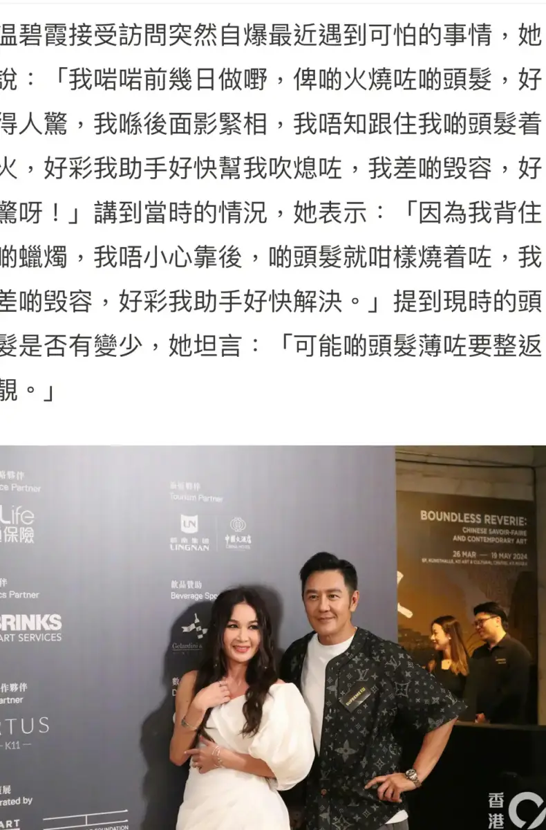 溫碧霞接受采訪時自曝出活動時頭發(fā)被蠟燭點燃,幸好助手幫她吹滅,自己差點毀容,很驚險!