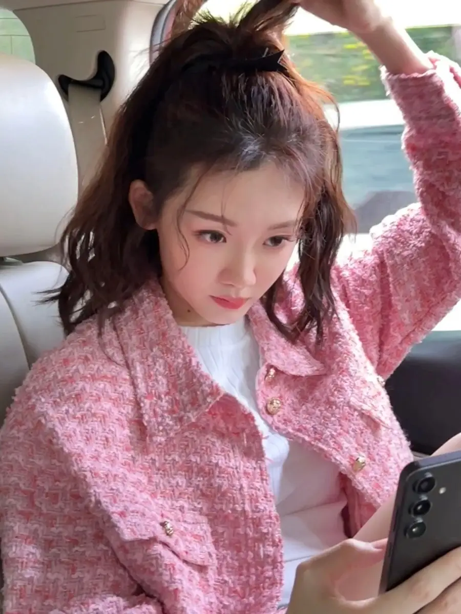苗苗穿粉色小香外套甜美精致 扎高馬尾少女感十足