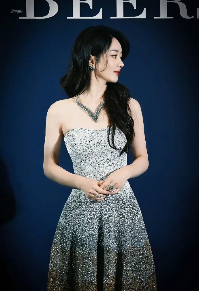 趙麗穎穿銀色閃光抹胸裙 長發(fā)微卷氣質(zhì)典雅似千金