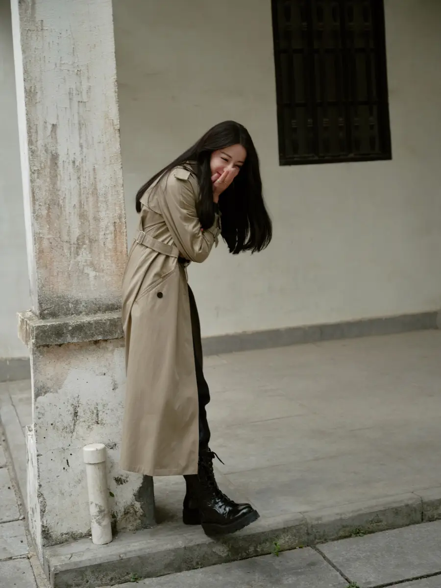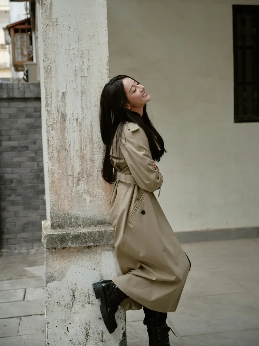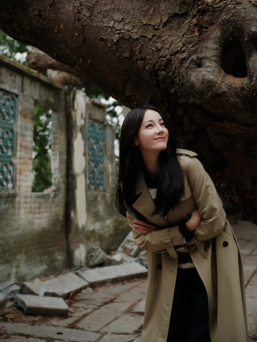 迪麗熱巴穿長款卡其色風(fēng)衣,在古鎮(zhèn)中漫步。