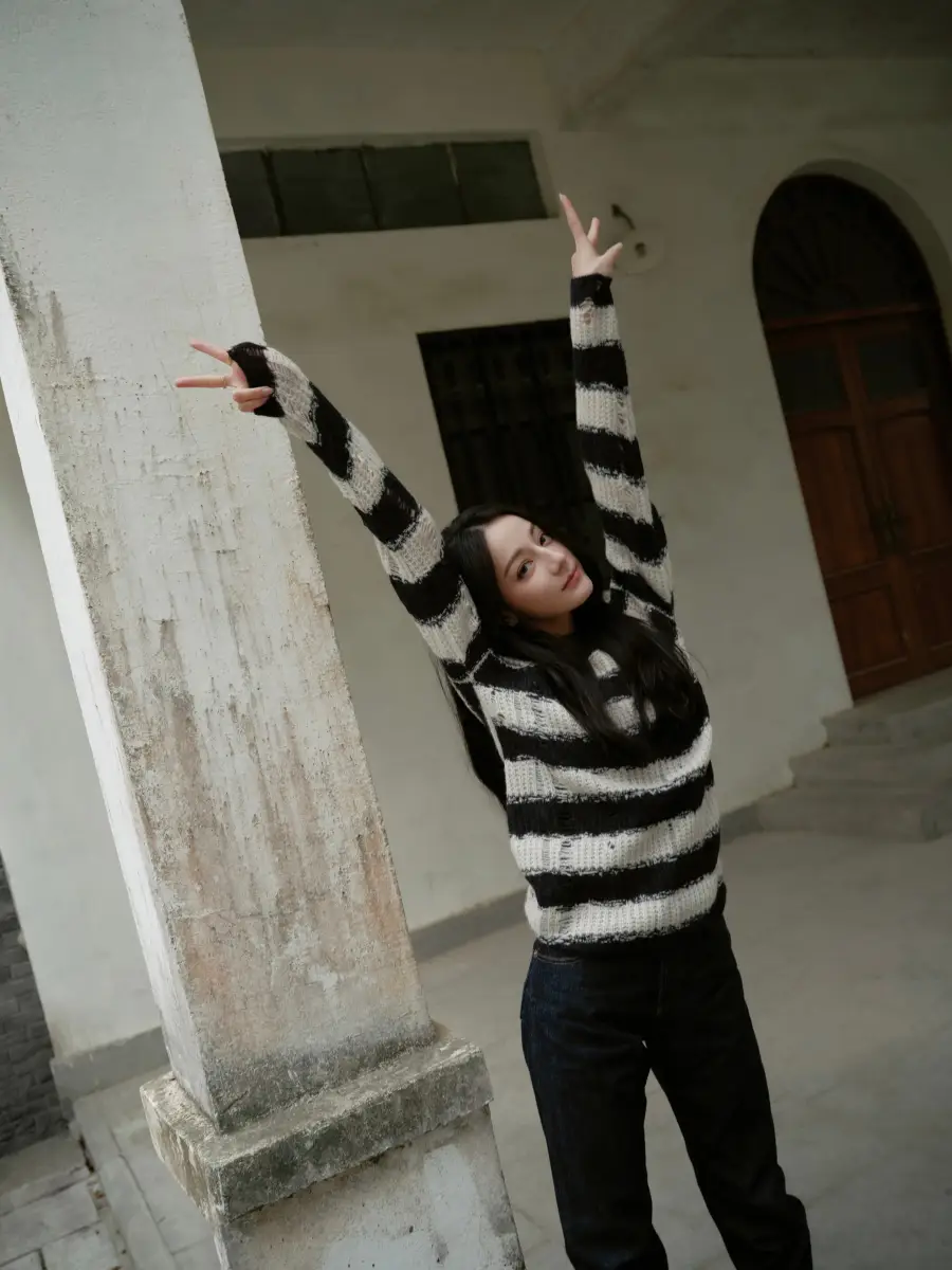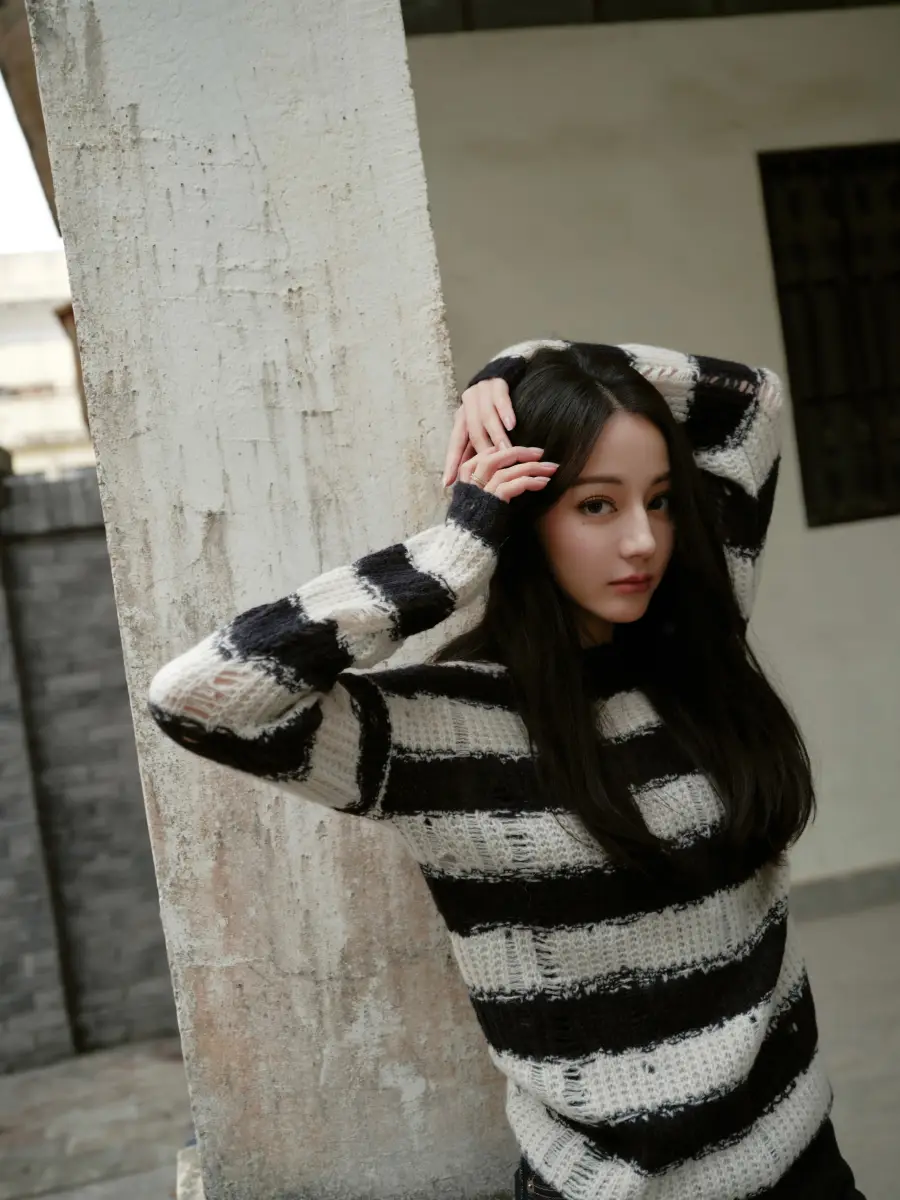 迪麗熱巴穿經(jīng)典黑白條紋,姿勢時尚,眼神放松。