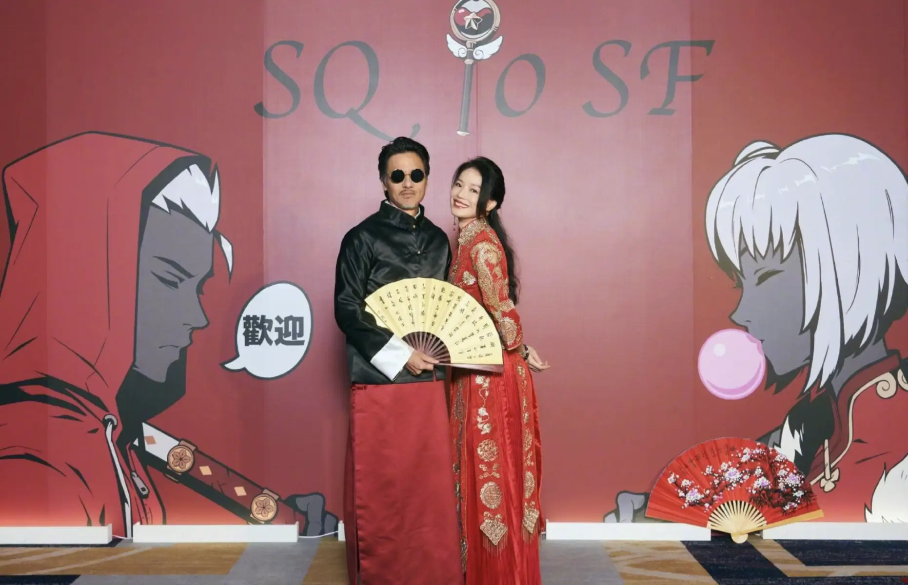 二人都穿中式婚服,一個戴墨鏡搖扇裝酷,一個笑容甜美,畫面溫馨,感情超好。