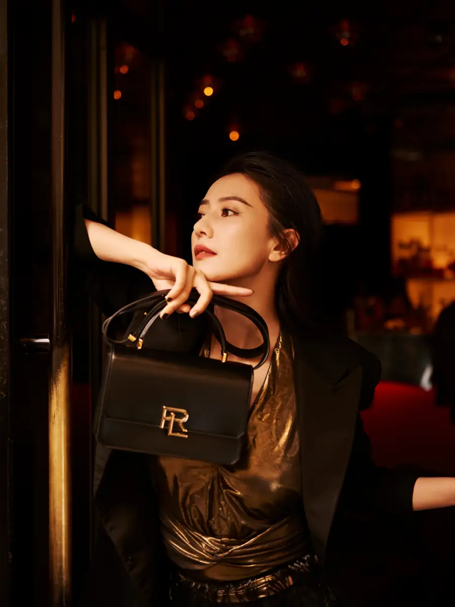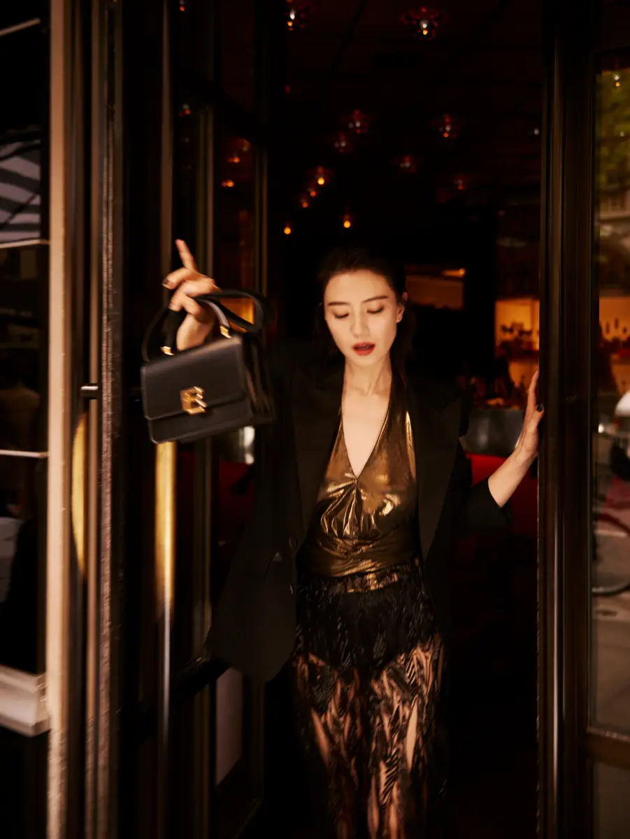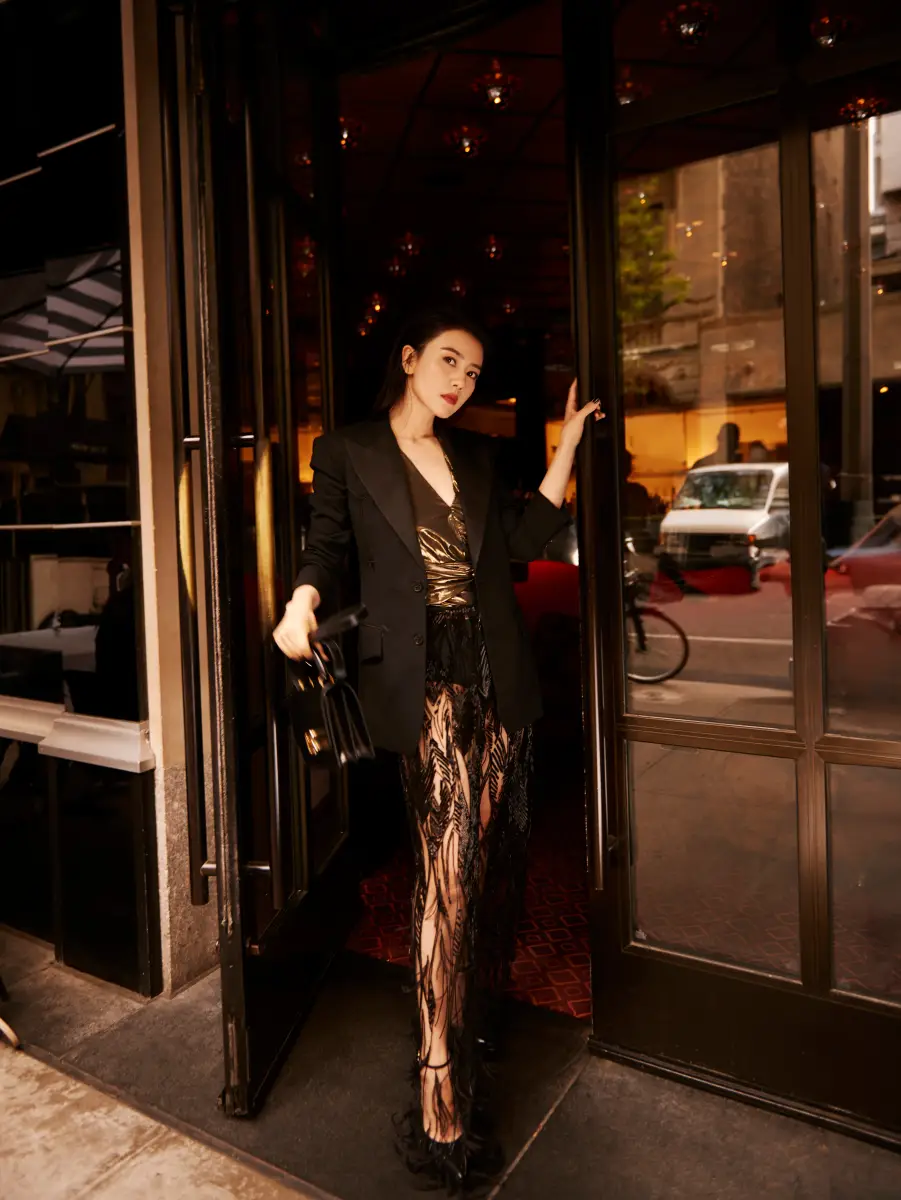 高圓圓做推門手勢,畫面很有故事感。