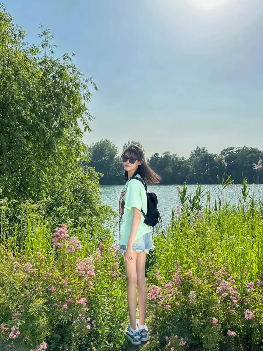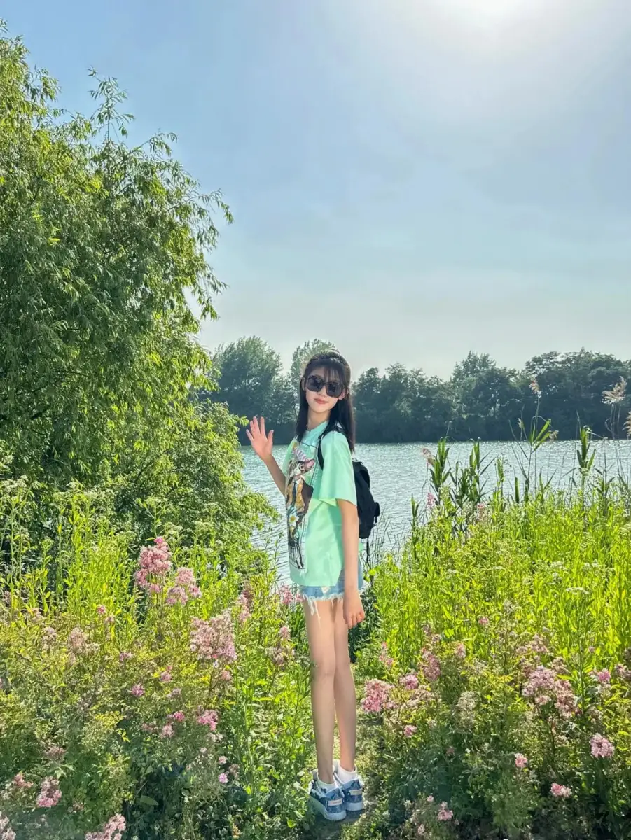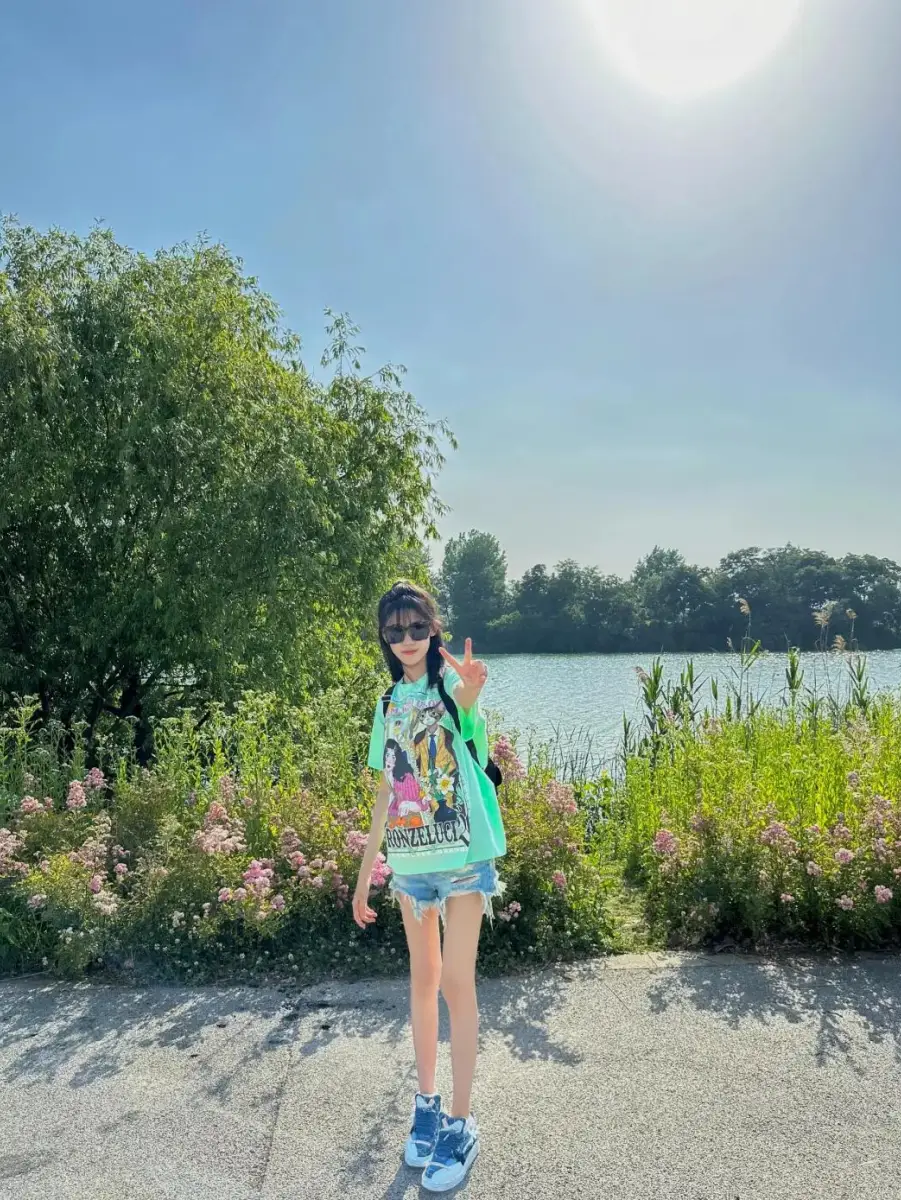 貝兒身穿綠色印花T恤,站在一片花草中,十分清新靚麗。