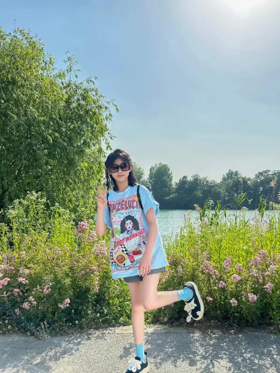 小葉子身穿藍(lán)色印花T恤,十分清爽可愛。
